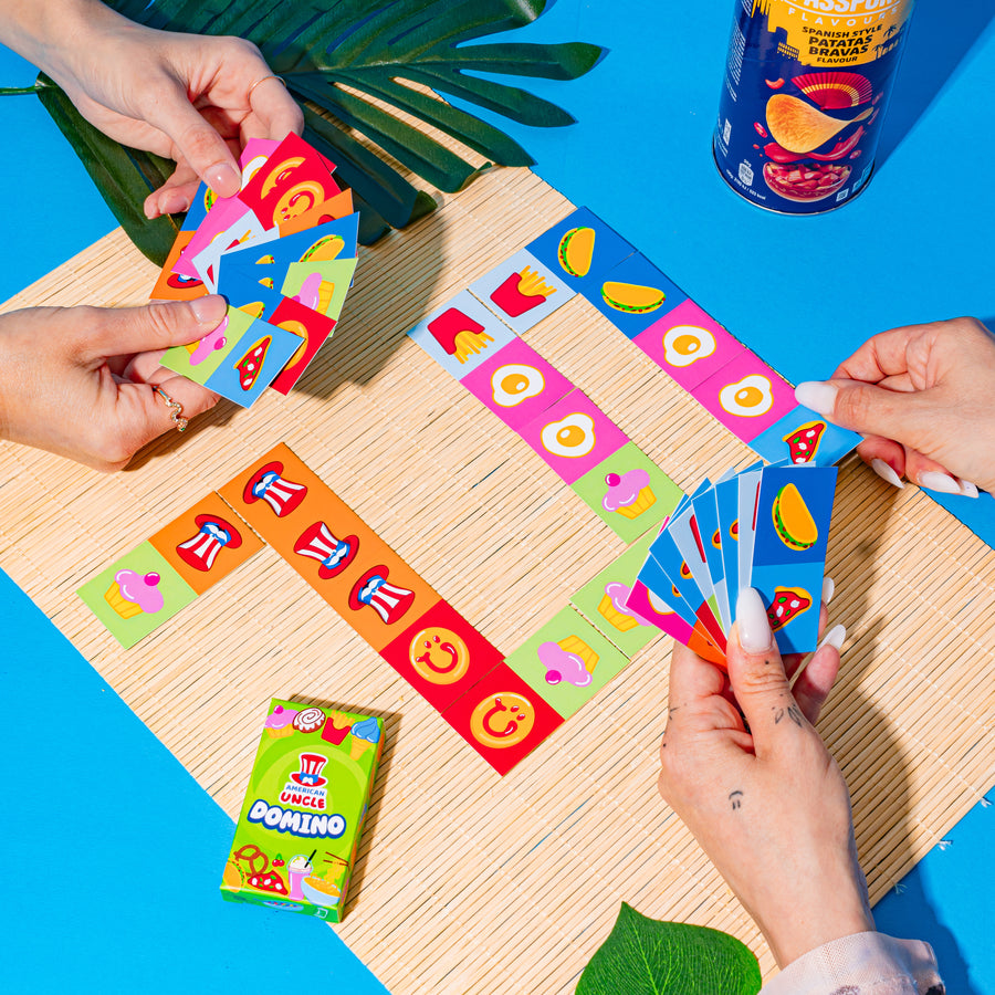 Pripremite se za zabavu s bezvremenskim klasikom: set "American Uncle Domino Game" uključuje 28 pločica s temom snack, savršenih za stvaranje ukusnog zmijolikog niza. Postavite pločice spajajući krajeve s istim snack i pokušajte potrošiti sve svoje pločice prije svih kako biste osvojili titulu prvaka!