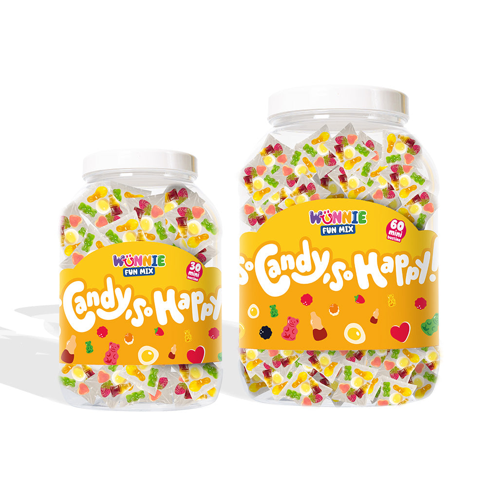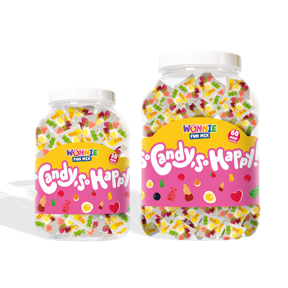 Wunnie Fun Mix je staklenka koja sadrži 30 ili 60 pojedinačnih pakiranja, svako s 20 g gumenih bombona različitih okusa!