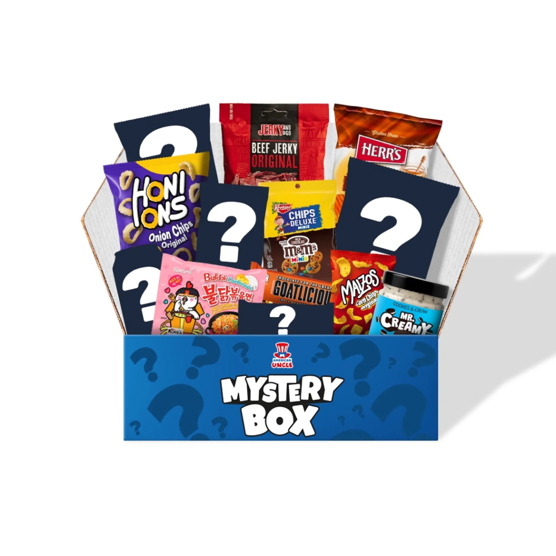 Mystery Box sadrži 20 iznenađujućih grickalica među kojima su slatkiši, slani proizvodi i pića iz cijelog svijeta: Kinder Tronky Milk & Biscuits, Honions Onion Chips, M&M's Minis Bite Size Cookies, Coca Cola Cherry, Mr. Creamy Cookies & Cream, Samyang Buldak Carbonara Hot Chicken su samo neki od njih!