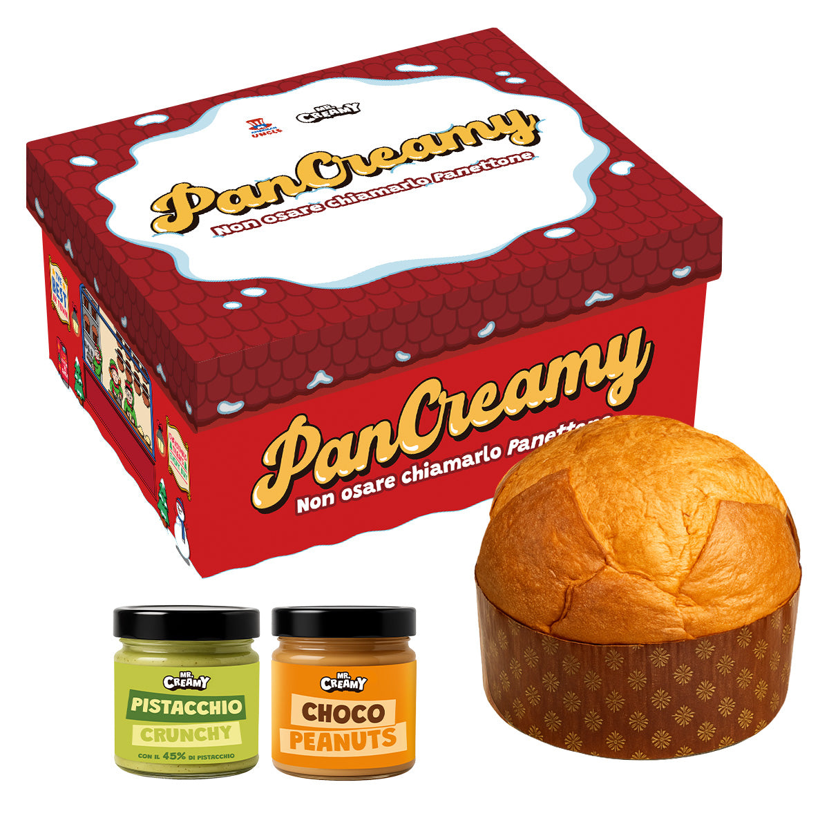 PanCreamy je definitivna reinterpretacija Panettonea: super mekani božićni desert koji će vas osvojiti na prvi zalogaj! Nazvati ga Panettoneom bila bi uvreda, PanCreamy je puno više! U kutiji ćete, naime, pronaći dvije Mr.Creamy kreme za mazanje u okusima po vašem izboru!